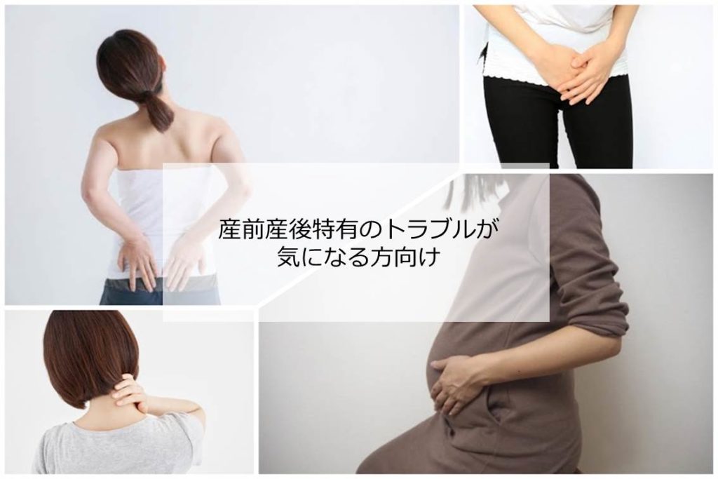 産後の骨盤 / 腹直筋離開 / 腰 / 肩・首 / 手首 / 股関節 / 骨盤底筋 / 恥骨 / 尾骨 / 坐骨神経 / お尻 / 膝 / 足 / ぽっこりお腹 / お風呂で膣にお湯が入る / 骨盤ベルトの使い方 / 抱っこひもの使い方 / 尿もれなど