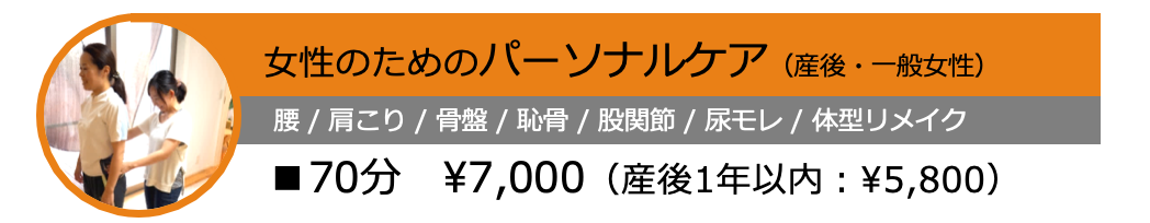 産後は、妊娠中のカラダの変化によってお腹の筋肉や骨盤底筋が伸び弱ってしまっている状態です。骨格を整えながらインナーマッスルのコツを掴み、体の芯からの回復をしていくコースです。