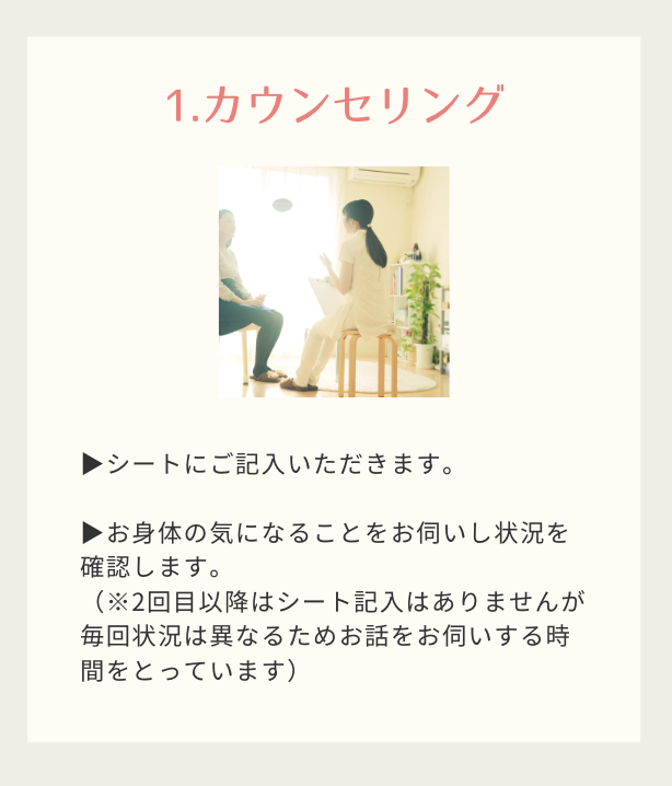 ※1回あたりカウンセリングなどを含めて90分ほどお時間をいただいております