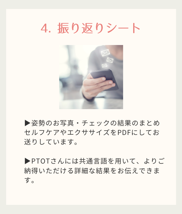 オンラインで体の状態をお伺いしながら、今の状態に合わせたセルフケアをお伝えしていくものになります。